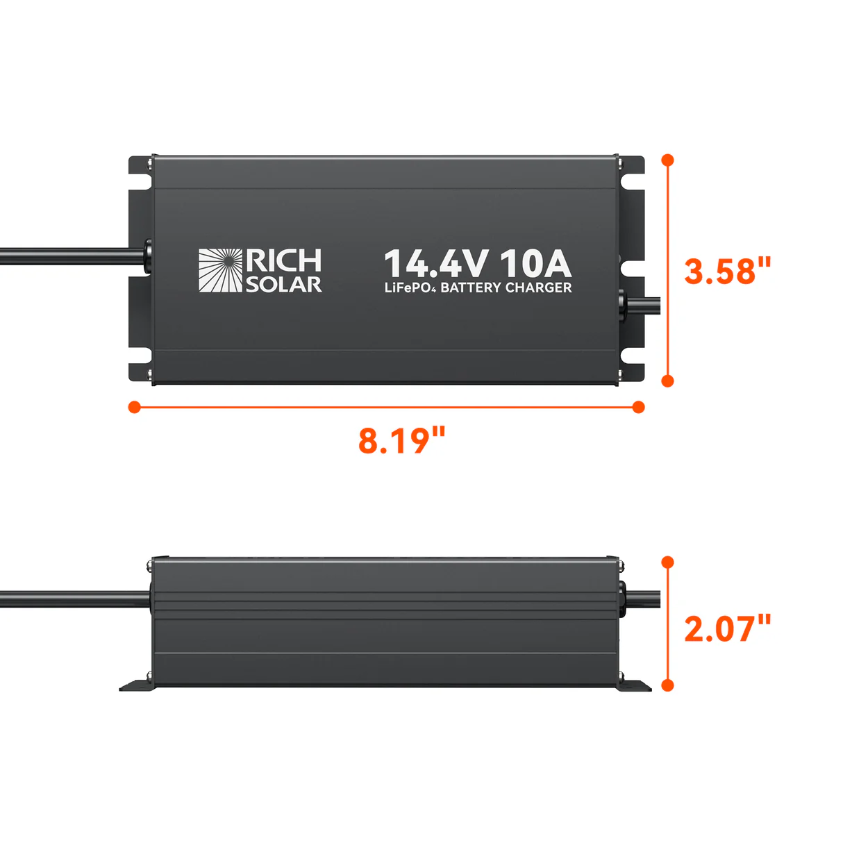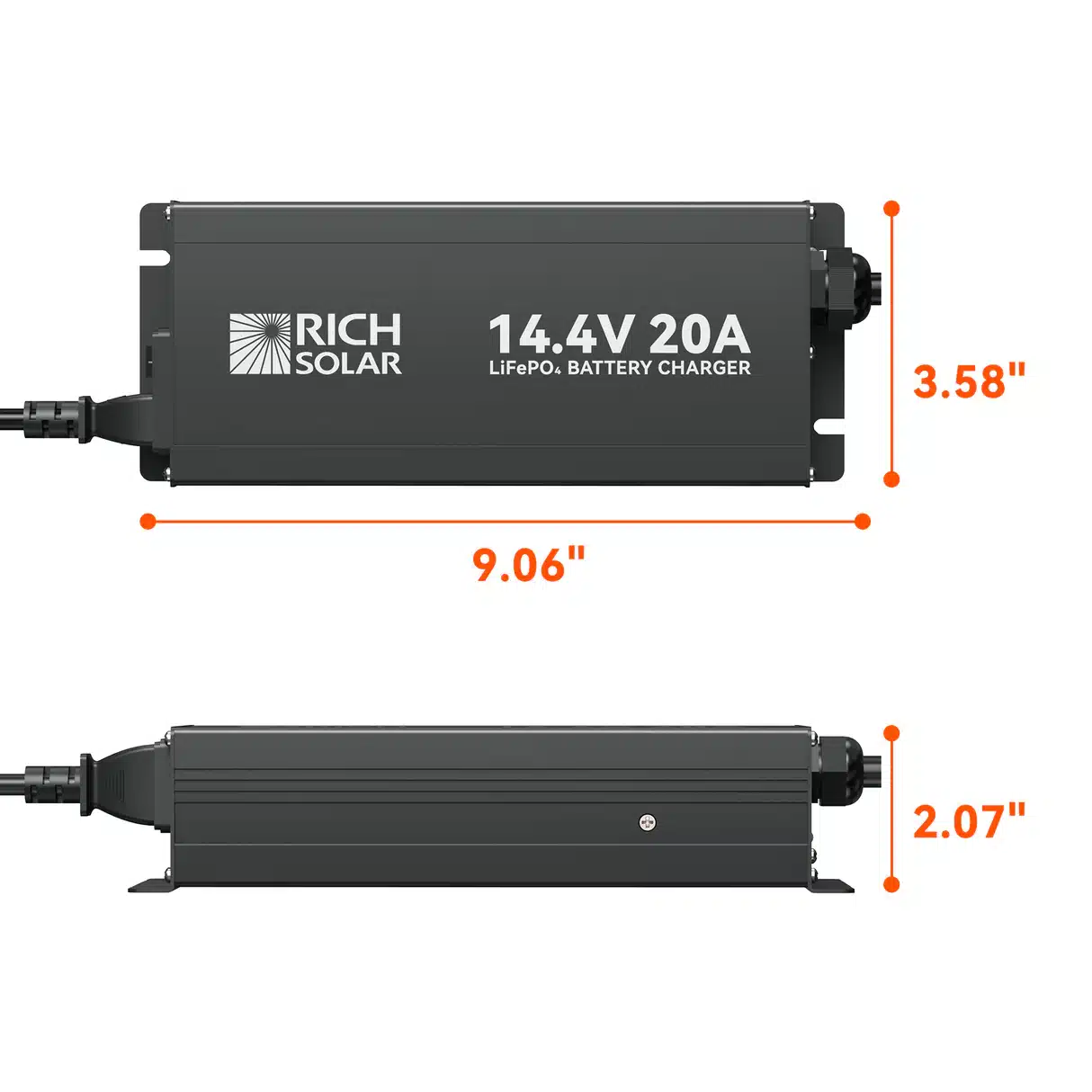 Rich Solar’s 12V 10 and 20A LiFePO4 Battery Chargers delivers a safe, efficient 14.4V charge with simple plug-and-play operation from any 100–240V AC outlet. Built with rugged aluminum housing, multiple safety protections, and clear LED status lights, it reliably wakes up BMS-protected lithium batteries and keeps them performing at their best.