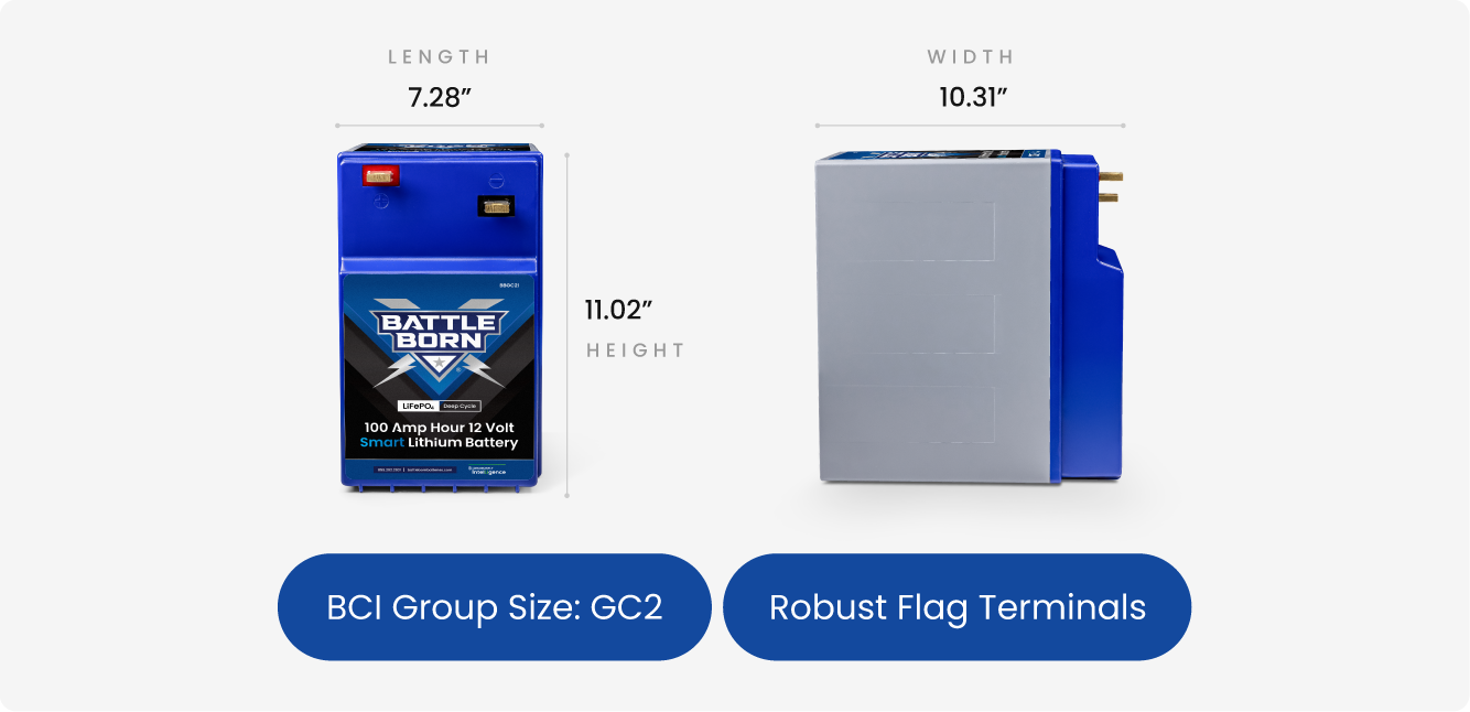 Many battery systems use pairs of 6V GC2 (Golf-Cart style) lead-acid batteries wired together to create a 12V battery bank. The Battle Born BBGC2 100Ah lithium battery is designed in the same GC2 battery footprint, allowing it to fit into many of these existing battery compartments.