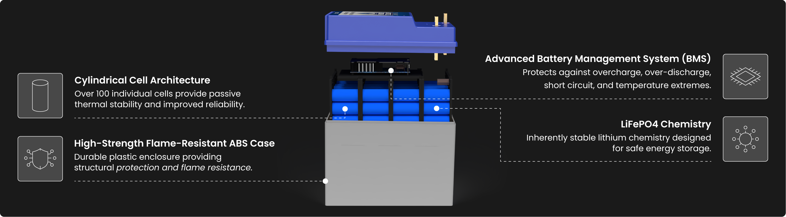 Stable lithium chemistry combined with integrated protections for safe, dependable operation.