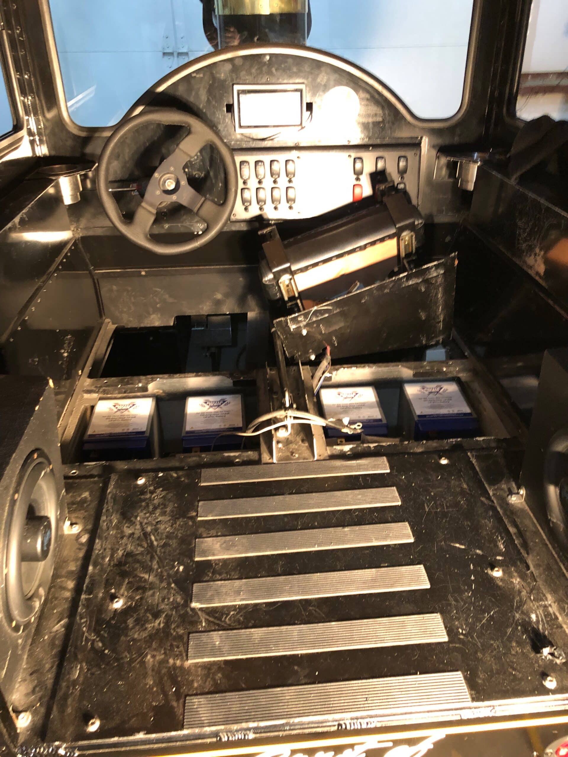 There are now (9) total 100Ah 12V GC2 Battle Born Batteries installed in the Boilermaker ‘X-tra Special’, four of which sit in the ‘train’s engine’ compartment, four under the driver’s seat, and one that powers the auxiliary components of the Boilermaker ‘X-tra Special’, including lights.